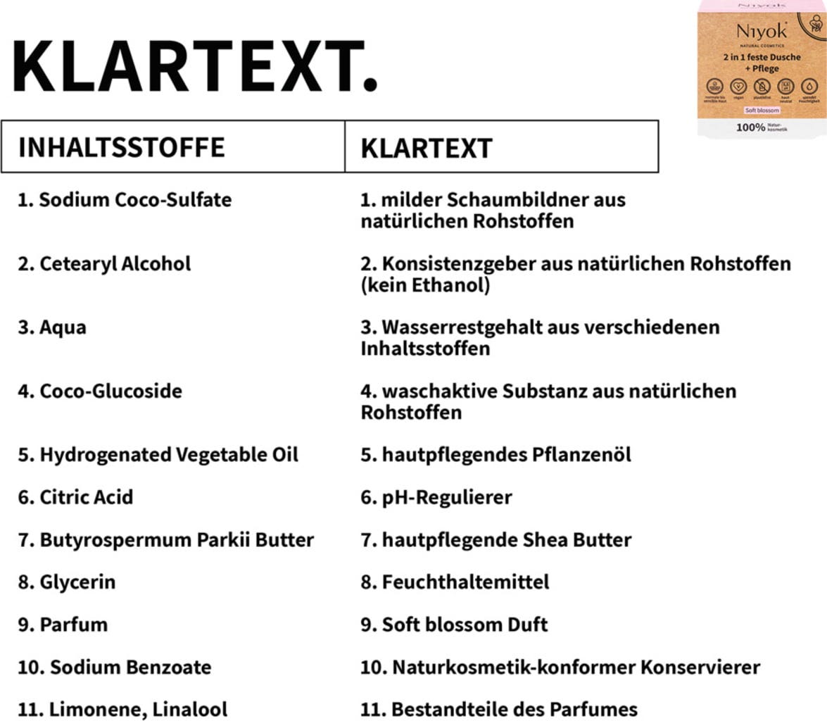 Sodium Coco Sulfate, Cetearylalcohol, Aqua, Coco Glucoside, Hydrogenated Vegetable Oil, Butyrospermum Parkii (Shea) Butter, Glycerin, Citricacid, Parfum, Sodium Benzoate, Limonene, Linalool