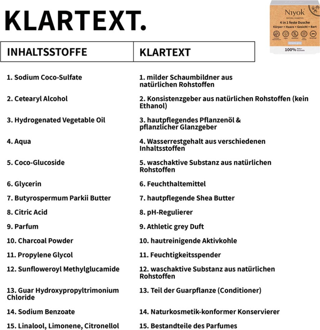 Sodium Coco Sulfate, Cetearylalcohol, Hydrogenated Vegetable Oil, Aqua, Coco Glucoside, Glycerin, Butyrospermum Parkii (Shea) Butter, Citricacid, Parfum, Charcoal Powder, Propylene Glycol, Sunfloweroyl Methylglucamide, Guar Hydroxypropyltrimonium Chloride, Sodium Benzoate, Linalool, Limonene, Citronellal