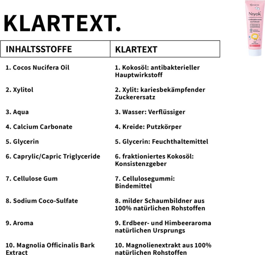 Cocos Nucifera (Coconut) Oil[1], Xylit, Aqua, Calcium Carbonate, Glycerin, Caprylic/Capric Triglyceride, Cellulose Gum, Sodium Coco­ Sulfate, Aroma, Magnolia Officinalis Bark Extract