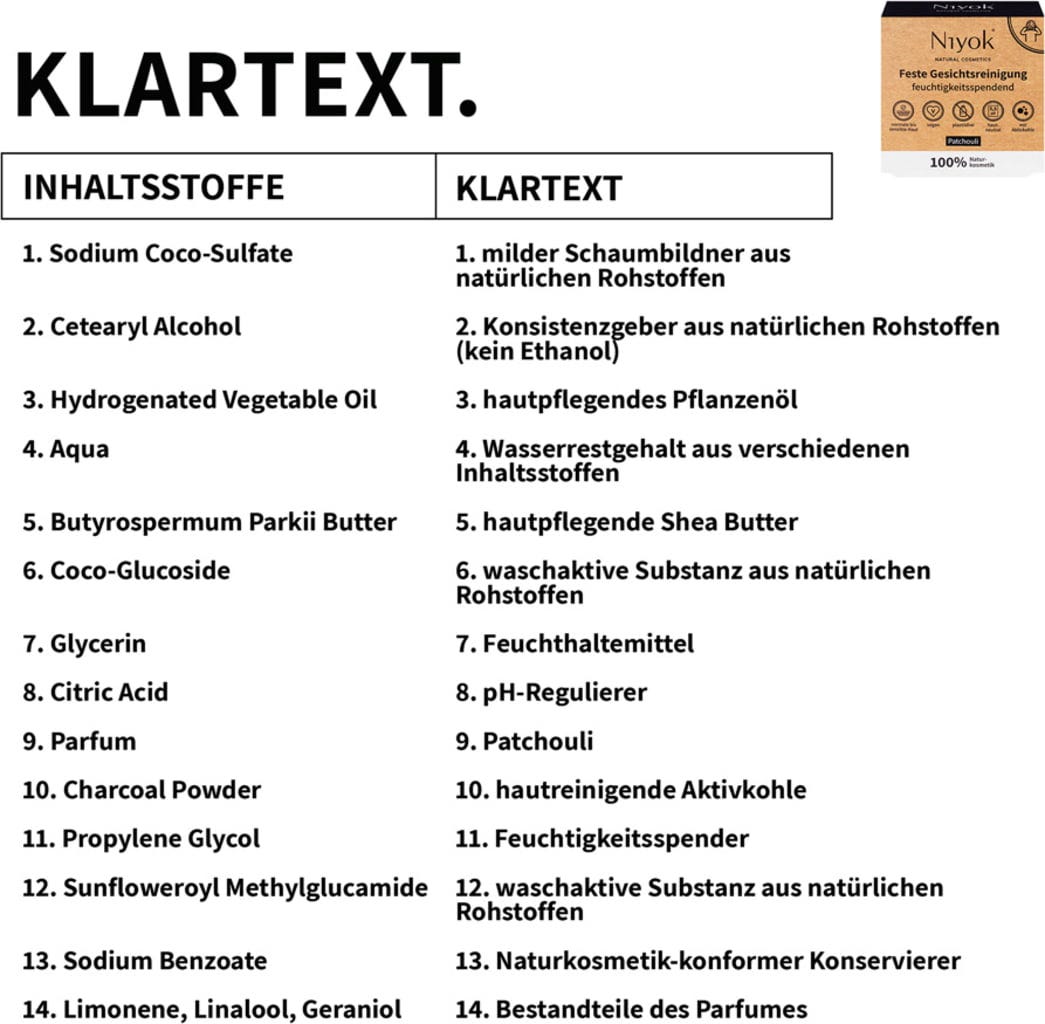 Sodium Coco Sulfate, Cetearylalcohol, Hydrogenated Vegetable Oil, Aqua, Butyrospermum Parkii (Shea) Butter, Coco Glucoside, Glycerin, Citricacid, Parfum, Charcoal Powder, Propylene Glycol, Sunfloweroyl Methylglucamide, Sodium Benzoate, Limonene, Linalool, Geraniol