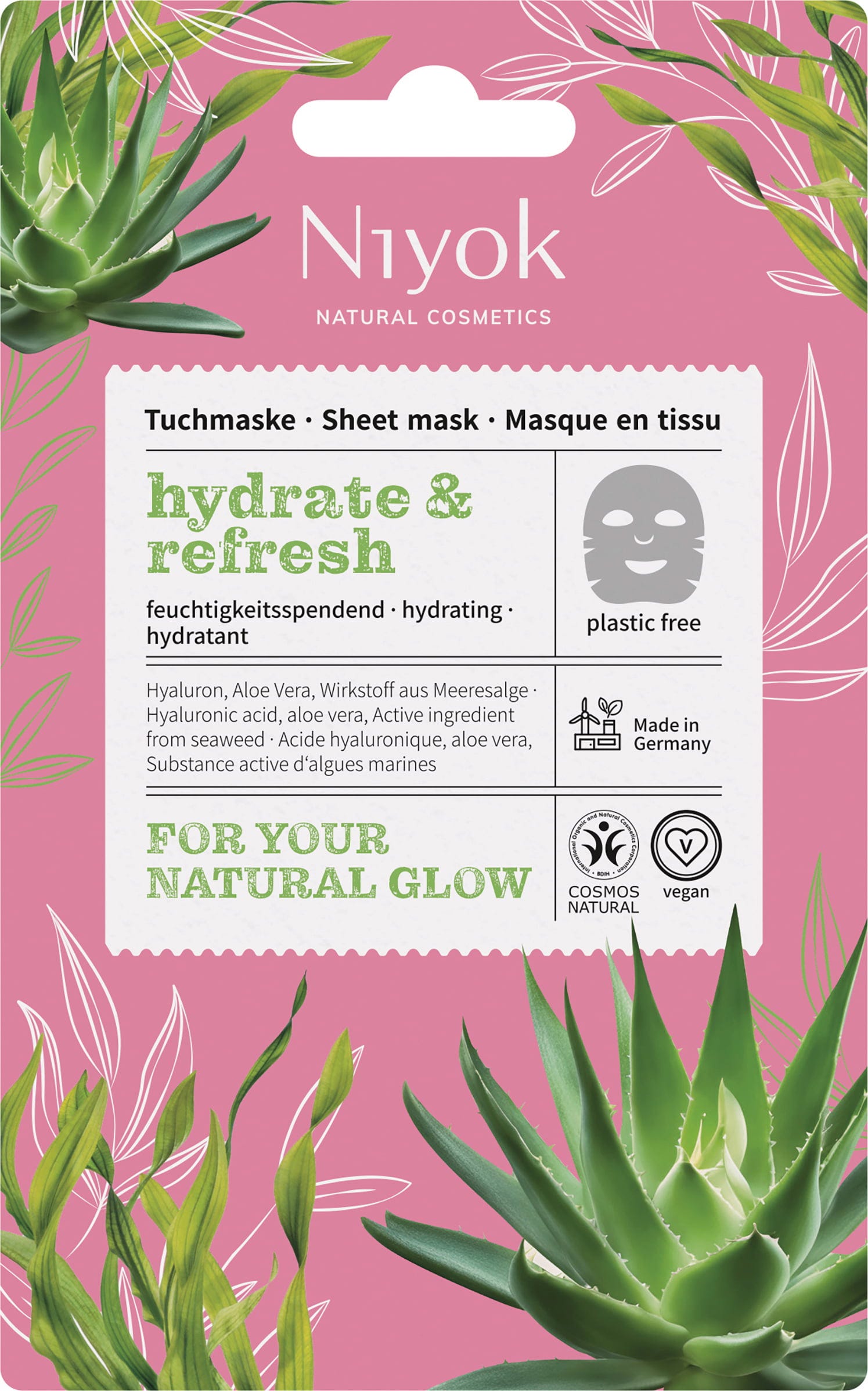 Fuktighetsgivende Ansiktsmaske Hydrate & Refresh er den optimale pleien for friskhet, hydrering og glød! Den inneholder en kombinasjon av to hyaluronsyrer, hvorav den ene sørger for overflatisk glatte og den andre fyller opp i de dypere hudlagene. Oppskriften er avrundet med Aloe Vera og ekstrakter fra en havalge for å gi oppstrammende egenskaper og glatte fine linjer.