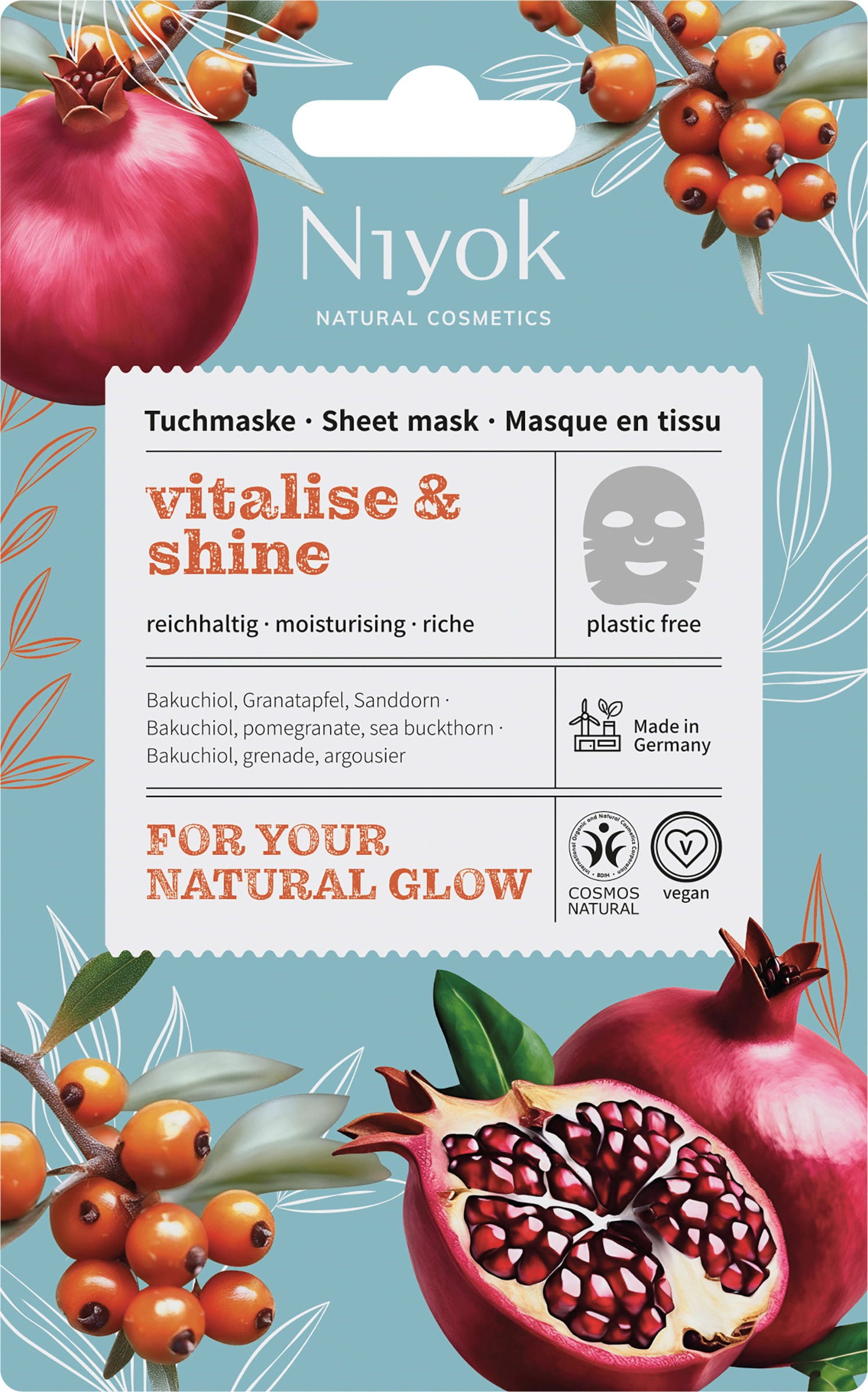 Den næringsrike tøymasken er formulert med Bakuchiol, granateplekjerneolje og tindved. Denne kombinasjonen pleier huden med flerumettede fettsyrer og gir fuktighetsgivende samt vitaliserende egenskaper. I tillegg er tøymaterialet laget av komposterbar plantefiber.