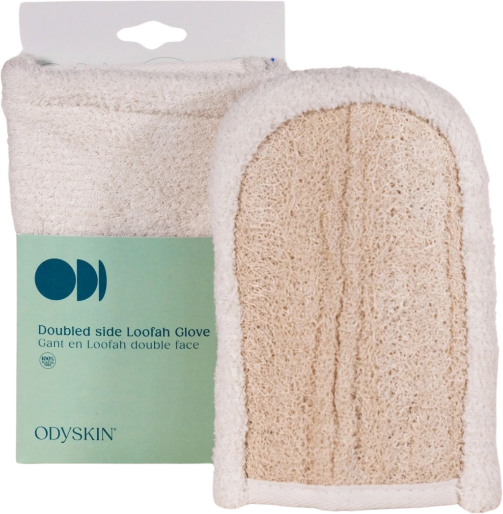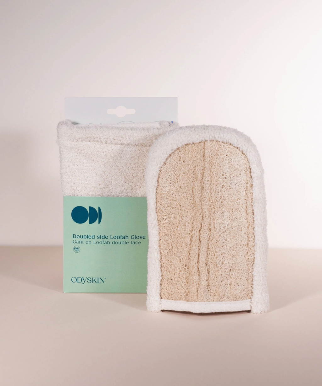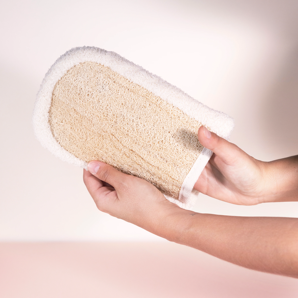 Den tosidige luffa-hansken er det perfekte verktøyet for å pleie huden din. Luffa-siden eksfolierer og etterlater huden vitalisert, noe som gjør den mer mottakelig for solkrem. Den andre siden er ideell for skånsomt å fjerne solkrem etter en dag i solen.