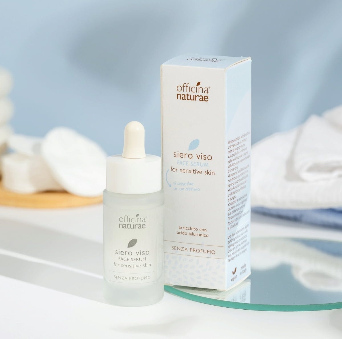 Dette parfymefrie ansiktsserumet er spesielt utviklet for pleie av sensitiv og lett irritert hud. Beriket med et naturlig innholdskompleks av planteekstrakter, bidrar pleien til å minimere irritasjoner og gir huden en følelse av ro. Formelen inneholder også hyaluronsyre, en kraftig fuktighetsgiver, samt glykosaminoglykaner som støtter hudens regenerering ved å aktivere den naturlige produksjonen av hyaluronsyre.