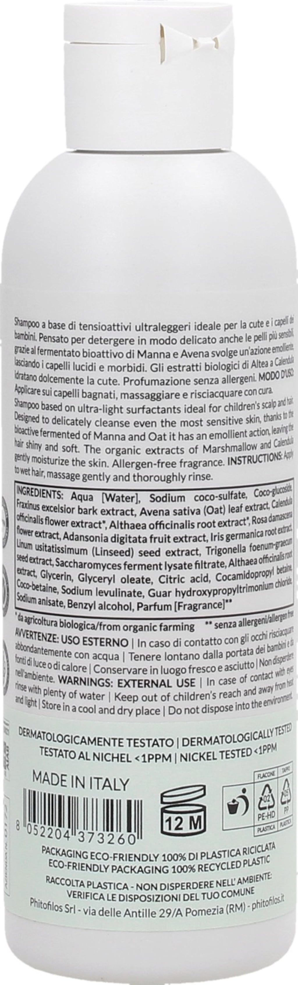 Shampooen er formulert med ultralette tensider, som er ideelle for hud og hår til babyer. Den er utviklet for å rengjøre på en svært mild måte, selv for den mest sensitive hud. Takket være de bioaktive fermentene fra ask og havre, har produktet mykgjørende egenskaper og etterlater håret glansfullt og mykt. Økologiske ekstrakter av legestokkrose og ringblomst gir samtidig skånsom hydrering til huden. Den milde duften er allergenfri.