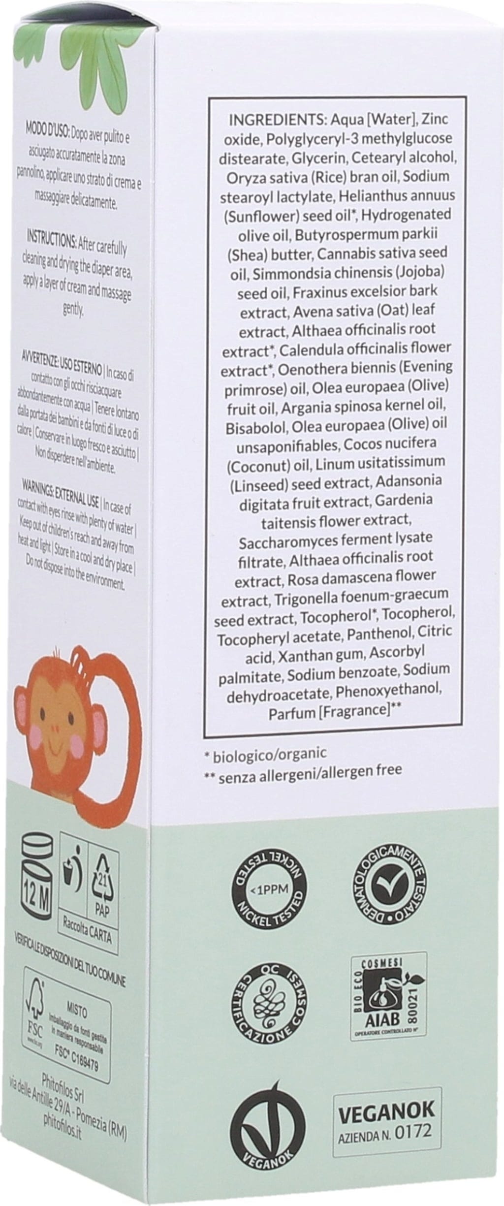 Aqua, Zinc Oxide, Polyglyceryl-3 Methylglucose Distearate, Glycerin, Cetearylalcohol, Oryza Sativa (Rice) Bran Oil, Sodium Stearoyl Lactylate, Hydrogenated Olive Oil, Butyrospermum Parkii (Shea) Butter, Cannabis Sativa (Hemp) Seed Oil, Simmondsia Chinensis (Jojoba) Seed Oil, Fraxinus Excelsior Bark Extract, Avena Sativa (Oat) Leaf/Stalk Extract, Althea Officinalis Root Extract[1], Calendula Officinalis Flower Extract[1], Oenothera Biennis (Evening Primrose) Oil, Olea Europaea (Olive) Fruit Oil, Argania Spinosa (Argan) Kernel Oil, Bisabolol, Helianthus Annus (Sunflower) Seed Oil[1], Olea Europaea (Olive) Oil Unsaponifiables, Cocos Nucifera (Coconut) Oil, Linum Usitatissimum Seed Extract, Adansonia Digitata Fruit Extract, Gardenia Taitensis Flower Extract, Iris Germanica Root Extract, Saccharomyces Ferment Lysate Filtrate, Althea Officinalis Root Extract, Rosa Damascena Flower Extract, Trigonella Foenum Graecum Seed Extract, Tocopherol (Vitamin E)[1], Tocopherol (Vitamin E), Tocopherylacetat, Panthenol, Citricacid, Xanthan Gum, Ascorbyl Palmitate (Vitamin C), Lactic Acid, Sodium Benzoate, Sodium Dehydroacetate, Phenoxyethanol, Parfum[2]