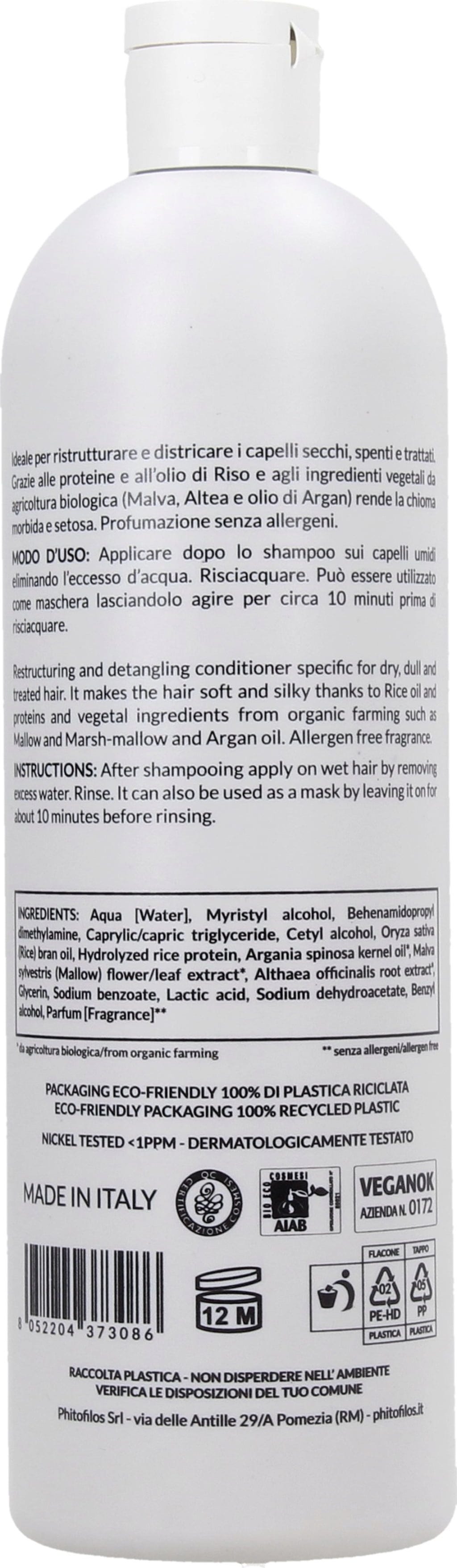 Denne myke balsamen fra Sinergia-linjen til Phitofilos er spesielt utviklet for å gi nytt liv til tørt, livløst, splittet og behandlet hår. Formuleringen med proteiner og riskimolje fester fargen etter bruk av fargende plantepulver og gir en silkemyk følelse.