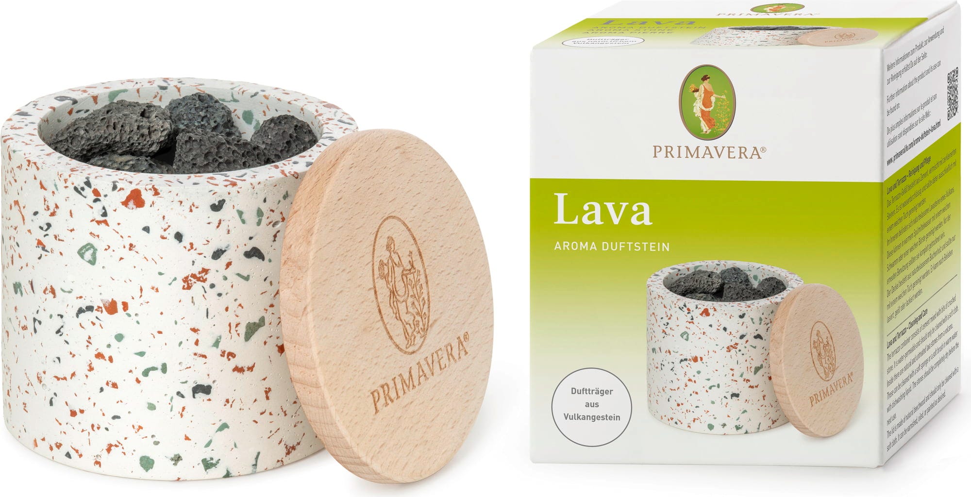 Med denne vakkert designede duftsteinen kan du harmonisere duft og design. Den runde beholderen, laget av terrazzo av høy kvalitet, imponerer med sine harmoniske linjer. Hver stein er unik, med subtile fargenyanser og en teksturert overflate. Inni er det naturlige lavasteiner, hvis åpne porestruktur gjør dem ideelle som duftbærere. Noen få dråper eterisk olje er nok til å subtilt fylle miljøet med aroma – uten varme eller strøm. Beholderen er avrundet av et lokk laget av ubehandlet bøketre, som beskytter innholdet og elegant fullfører helhetsinntrykket. Enten på skrivebordet, på badet eller i gangen – duftsteinen tilpasser seg diskret ethvert miljø.