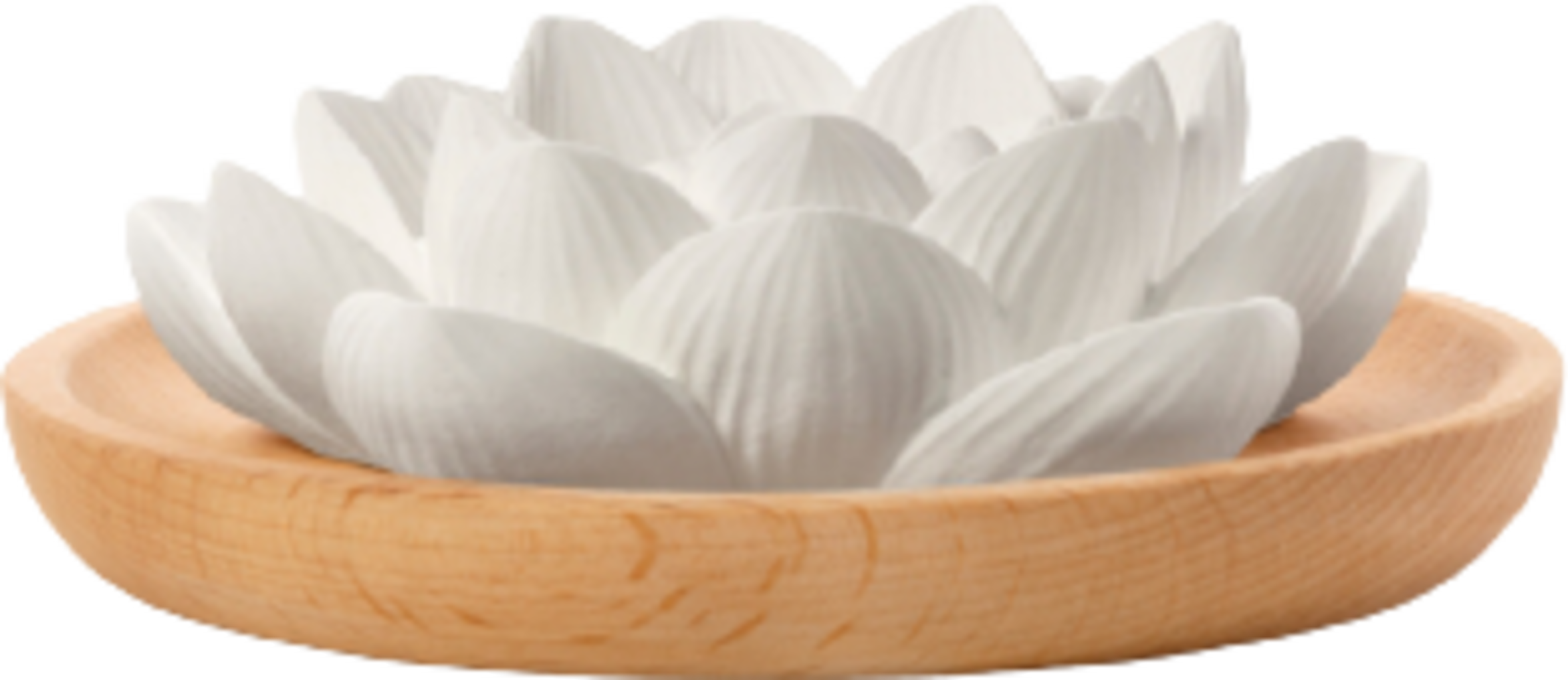 Denne lotusblomsten lar alle dufter blomstre og er optimal for å fylle små rom med en behagelig duft. Blomsten er laget av uforseglet gips og underfatet er av bøk fra bærekraftig skogbruk. Noen få dråper er nok for en perfekt duftopplevelse.