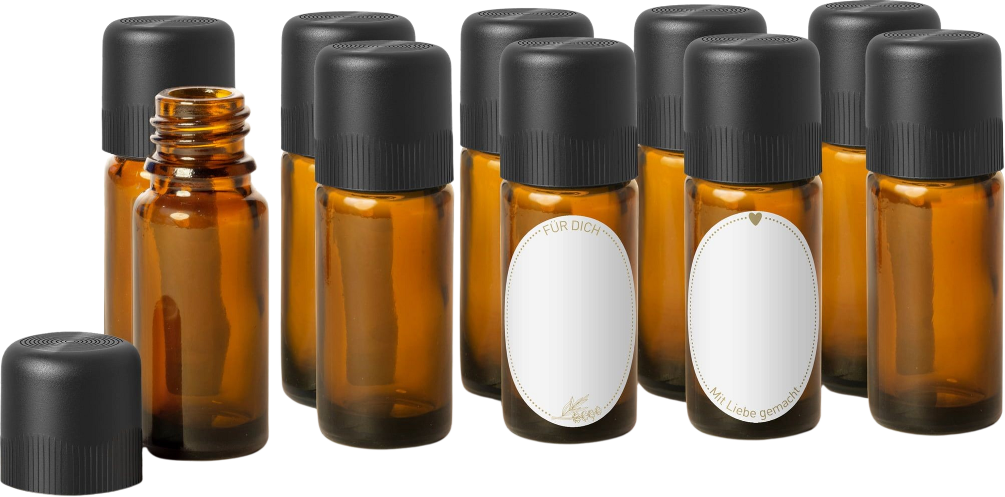 - 10 brunglassflasker à 10 ml: Den mørke fargen på glasset gir bedre lysbeskyttelse for innholdet. Dråpeinnsatsen sørger for presis bruk.