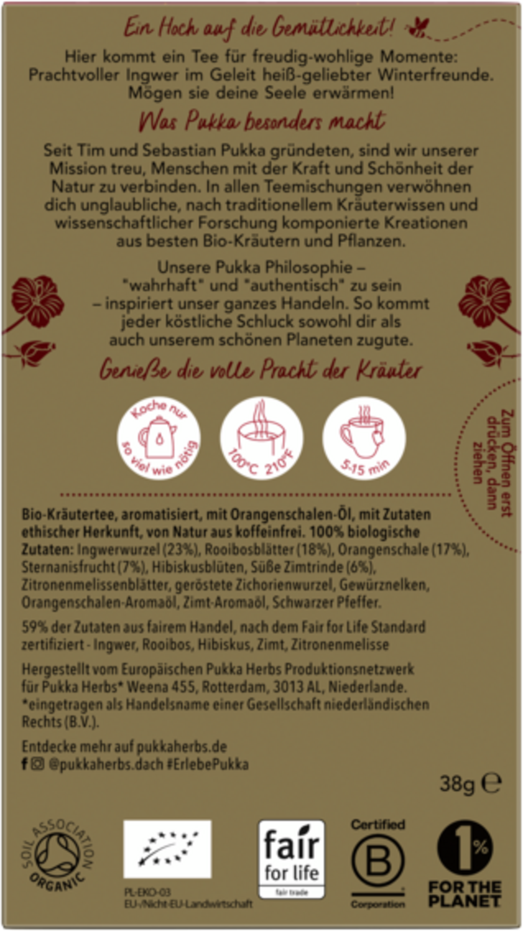 | Ansvarlig næringsmiddelforetak: | Lipton Teas and Infusions Germany GmbH, Axel-Springer-Platz 3, c/o WeWork, 20355, Hamburg, Tyskland, kontakt@pukkaherbs.de |