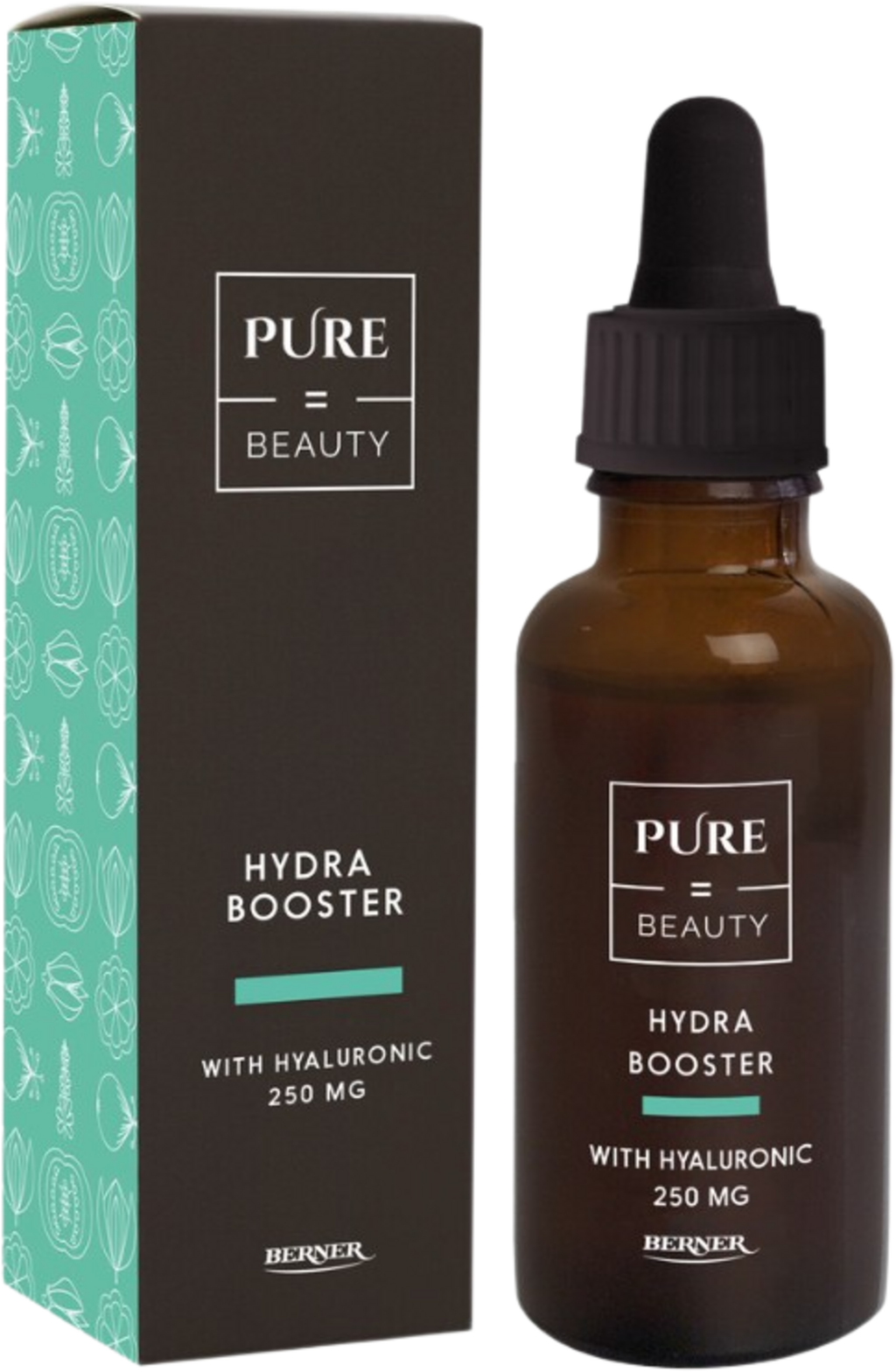 Hydra Booster Serum fra Pure=Beauty inneholder 250 mg hyaluronsyre fra to ulike molekylvekter. Denne spesielle ingrediensen er kjent for sine plumpende og glättende egenskaper, som forsterkes av finsk sukkerbete. Appelsinvann frisker opp hudtonen, og ekstrakt av finske grantrær kvister beskytter huden med mange antioksidanter og lysner den forsiktig. Gir en strålende, frisk og fornyet hudtone!