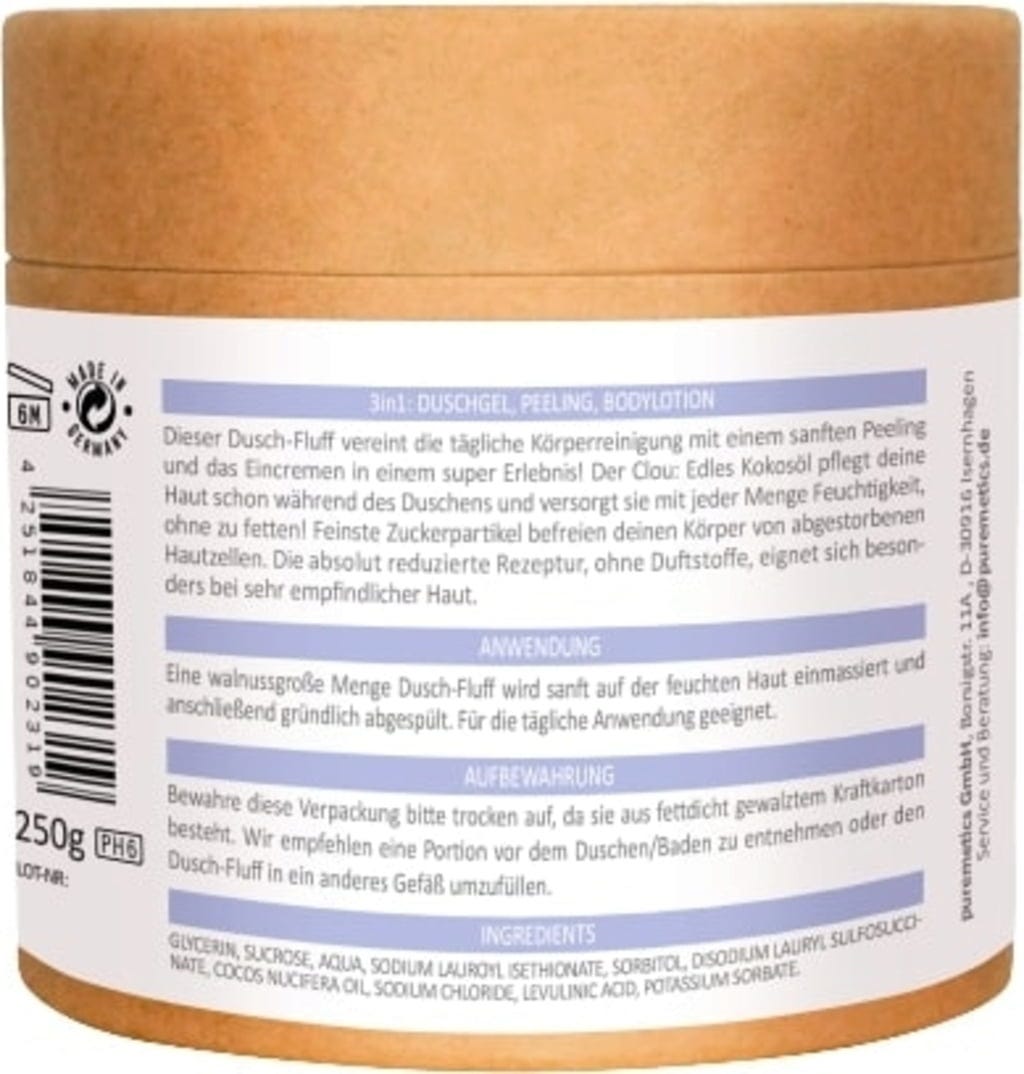 Rengjøring, peeling og pleie – 3in1 Dusj-Fluff inneholder alle velværeelementene, spesielt utviklet for sensitiv eller tørr hud. Finkornet sukker fjerner døde hudceller og sørger for en jevn hudoverflate. I mellomtiden gir kokosolje og vegetabilsk glyserin beskyttelse mot ytre påvirkninger. Takket være den gjennomtenkte og luftige formelen trenger du ikke smøre deg inn etter vask. Uten duftstoffer og allergener kan også sensitiv hud nyte dusjen!
