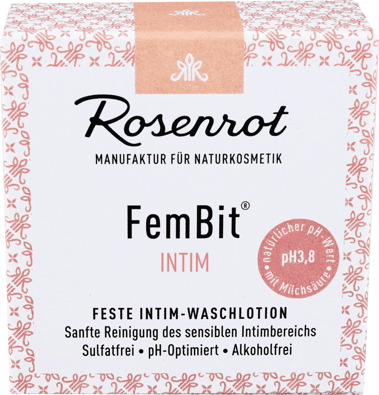 Med FemBit® Intim blir den kvinnelige intimsonen rengjort svært skånsomt med en formel spesielt tilpasset behovene i dette området. pH-verdien til den faste vaskesåpen er justert til 3,8 ved hjelp av melkesyre, noe som støtter balansen i intimfloraen. Samtidig gir verdifulle økologiske ekstrakter fra Aloe Vera og nyperosefrø huden nærende lipider, samtidig som de fremmer cellefornyelsen.