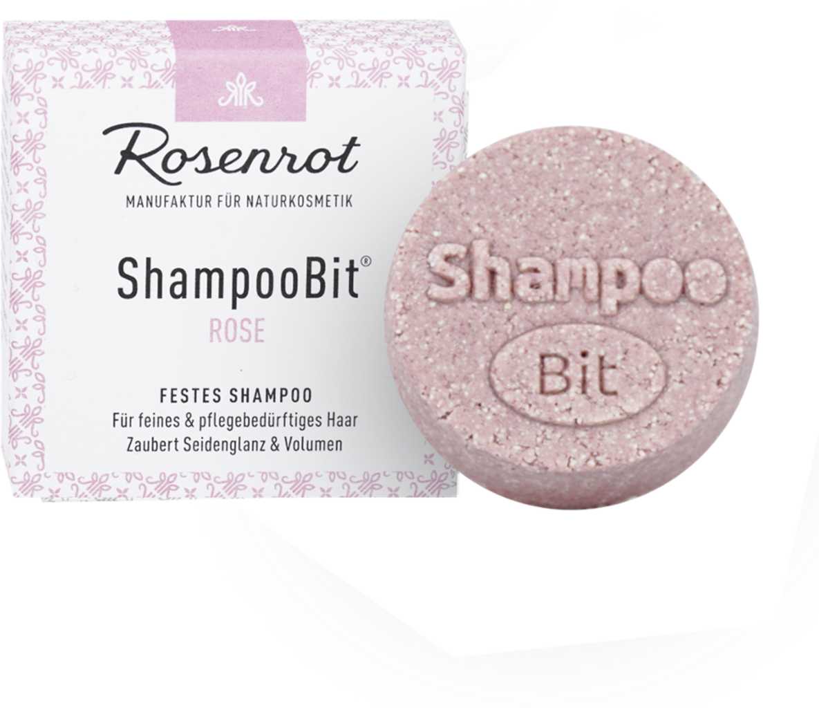 Det veganske ShampooBit® Rose renser normalt til fint hår og styrker det. Verdifull økologisk roseblomst-ekstrakt samt kakao- og sheasmør pleier håret allerede under vaskingen og gir en silkeaktig glans. Håret får volum og dufter uimotståelig av villrose.