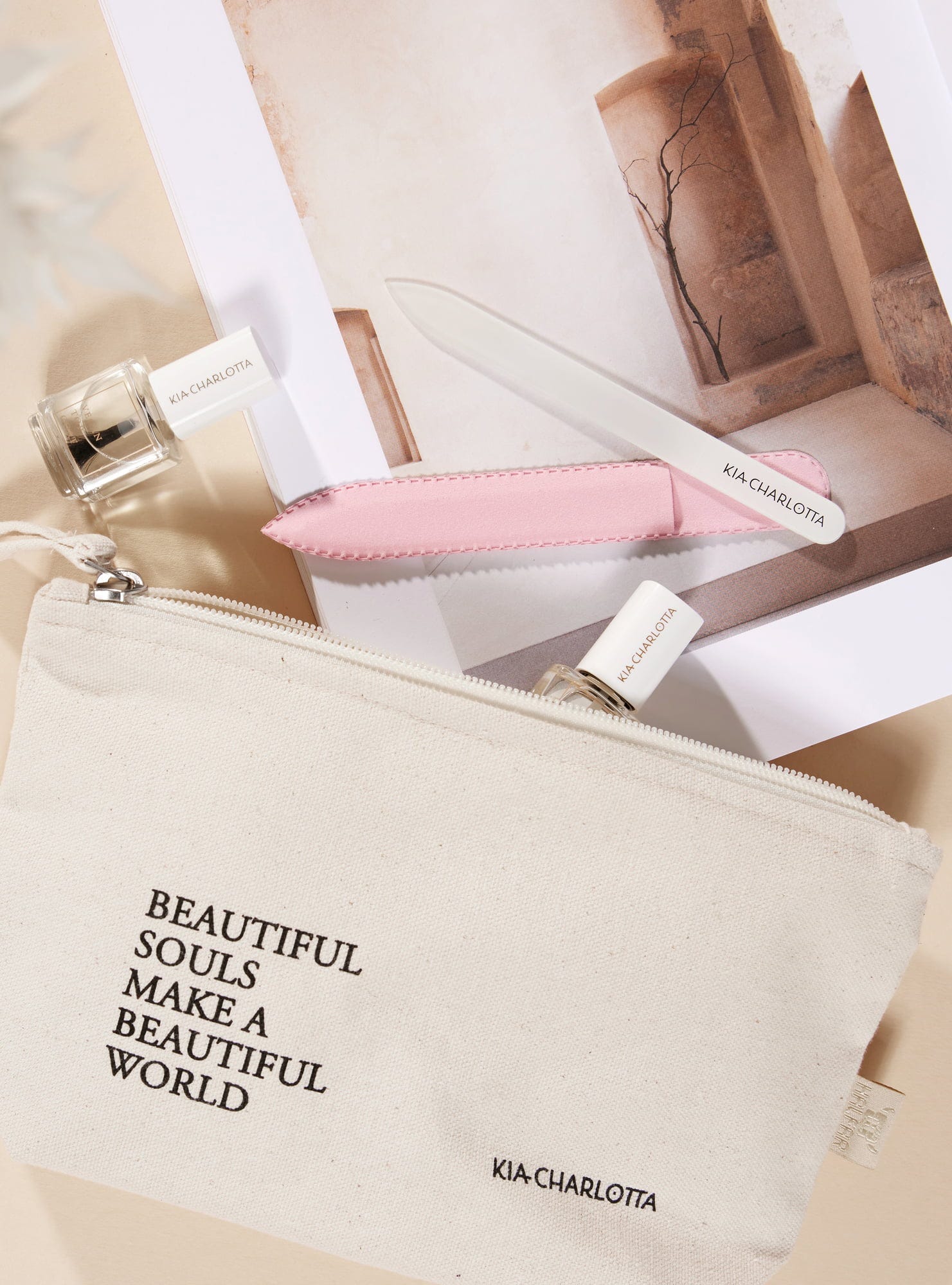 Glasfilen fra KIA-CHARLOTTA er kjent for sin fine overflatestruktur som sikrer en svært skånsom og presis påføring. Den milde slipingen passer også godt for skjøre, slitte negler og setter dem i perfekt form. Laget av ett enkelt stykke glass er den spesielt holdbar og lett å rengjøre. Den elegante, veganske fløyelsvesken beskytter filen og er ideell for transport og oppbevaring.