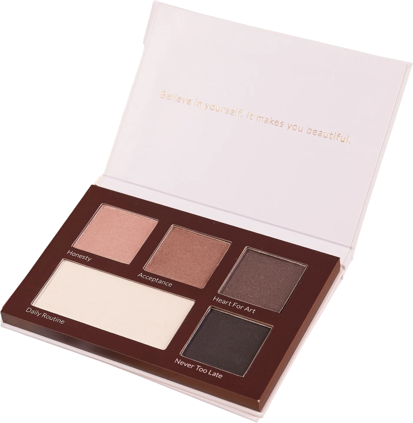 Denne paletten inneholder fem duse fargetoner med skinnende finish, som du kan kombinere på uttallige måter. Deres høypigmenterte, myke tekstur er lett å påføre og gir et langvarig fargerik resultat, samtidig som den delikate huden pleies med økologisk jojobaolje og vitamin E. Emballasjen er plastfri og miljøvennlig.