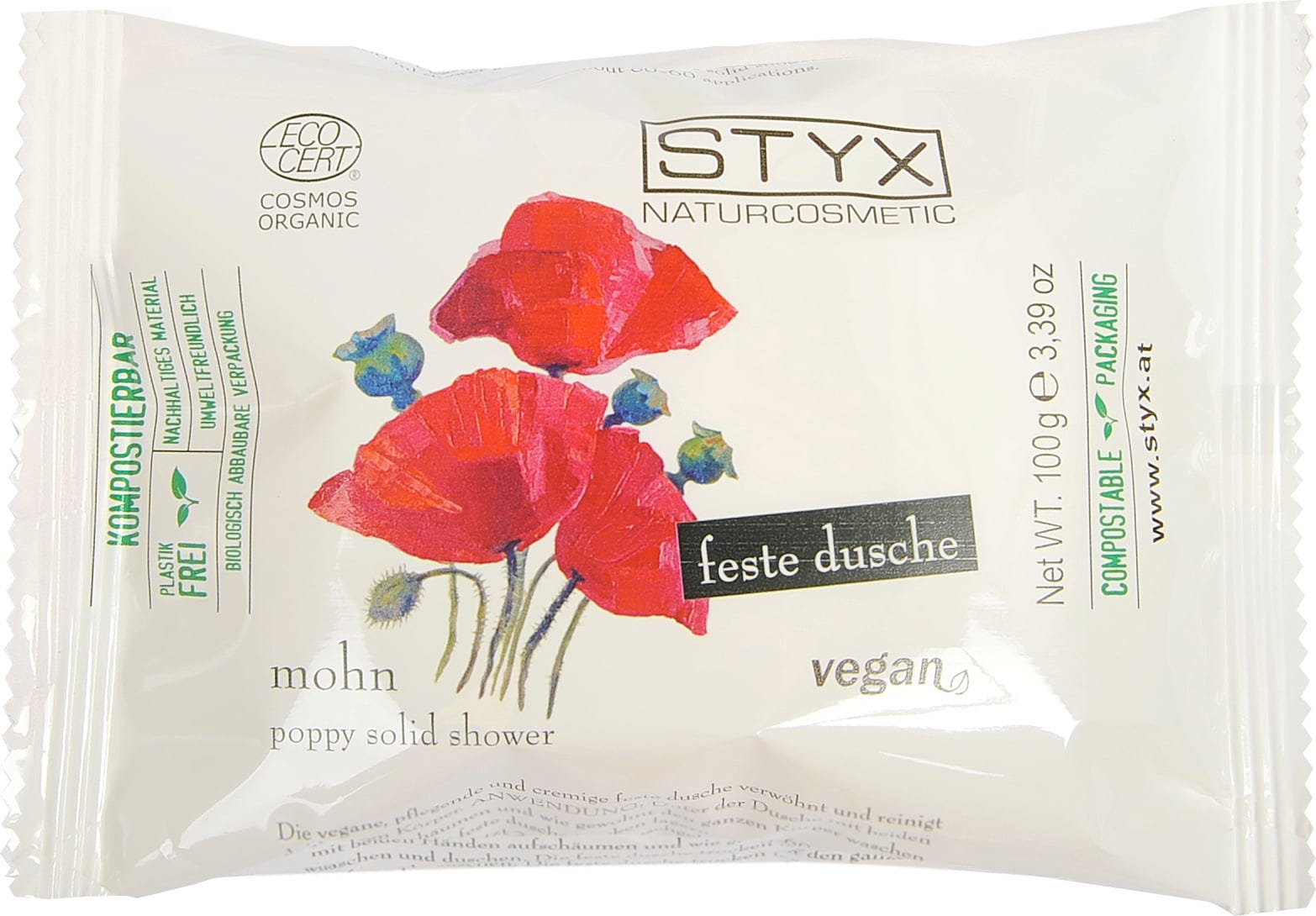 Den faste såpestykke fra Styx kommer i biologisk nedbrytbar emballasje hjem til deg og forvandler hver dusj til et øyeblikk av velvære. De verdifulle ingrediensene i valmue og næringsrik sheasmør pleier huden silkemyk. Såpen er meget drøy i bruk og erstatter 600 ml dusjgel.