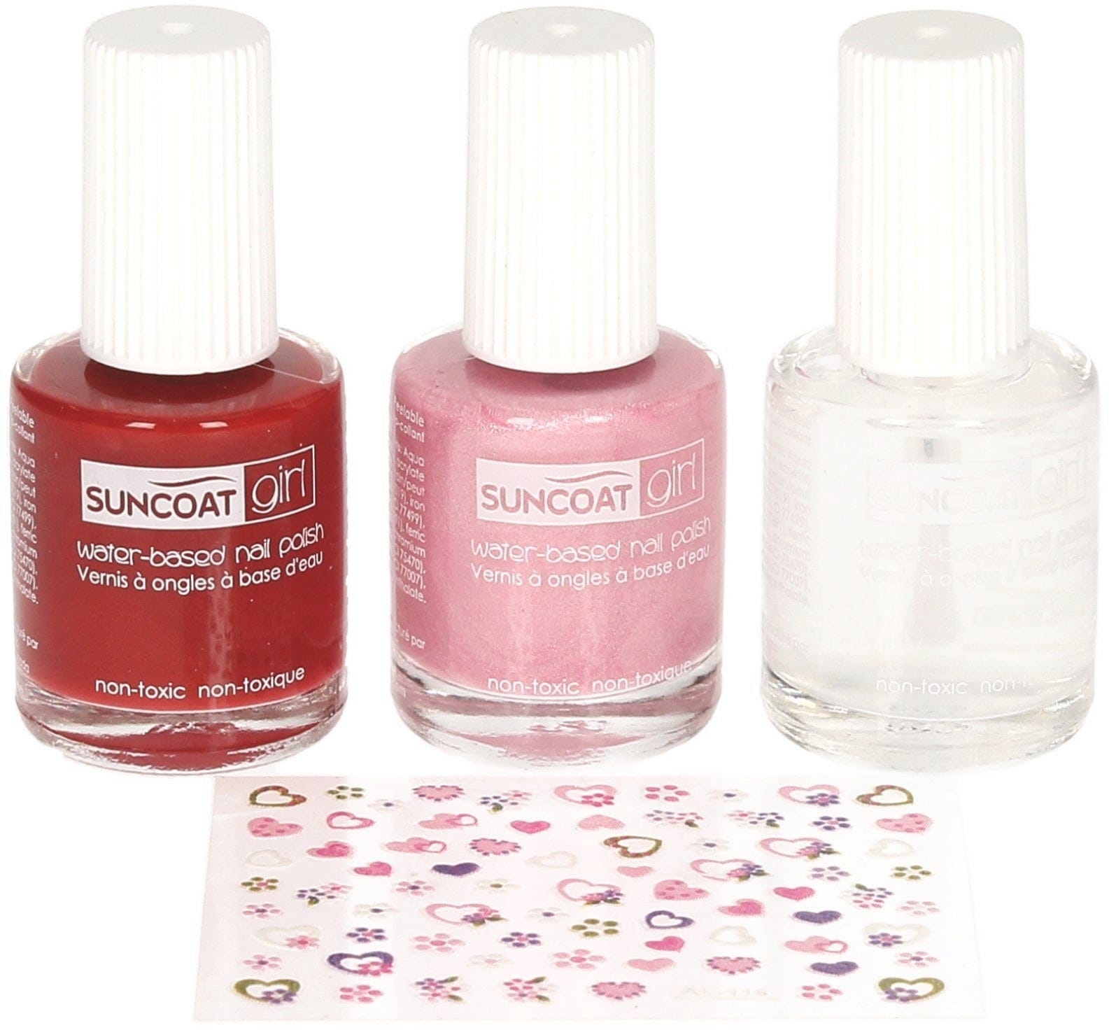 Dette søte gave-settet for jenter inneholder tre neglakker og negleklistremerker.