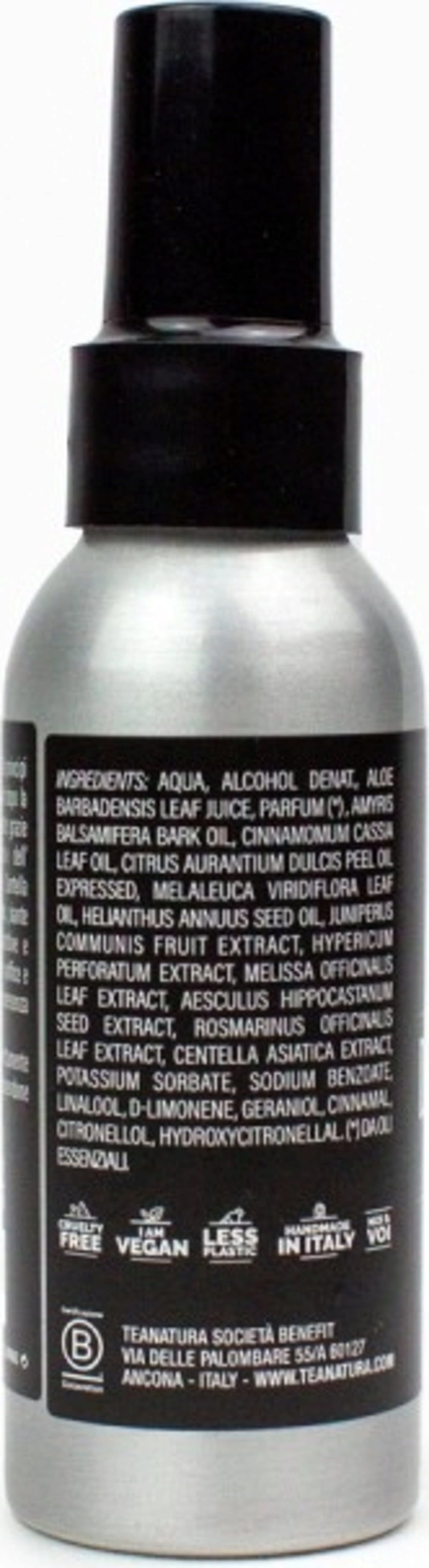 Aqua, Alcohol Denat, Aloe Barbadensis Leaf Juice, Parfum[1], Amyris Balsamifera Bark Oil, Cinnamomum Cassia (Cinnamon) Leaf Oil, Citrus Aurantium Dulcis Peel Oil, Melaleuca Viridiflora Leaf Oil, Heliantus Annuus Seed Oil Unsaponifiables, Juniperus Communis (Wacholder) Fruit Extract, Hypericum Perforatum Extract, Melissa Officinalis Leaf Extract, Aesculus Hippocastanum (Horse Chestnut) Seed Extract, Rosmarinus Officinalis Leaf Extract, Centella Asiatica Extract, Potassium Sorbate, Sodium Benzoate, Linalool, D-Limonen, Geraniol, Cinnamal, Citronellal, Hydroxy Citronellal