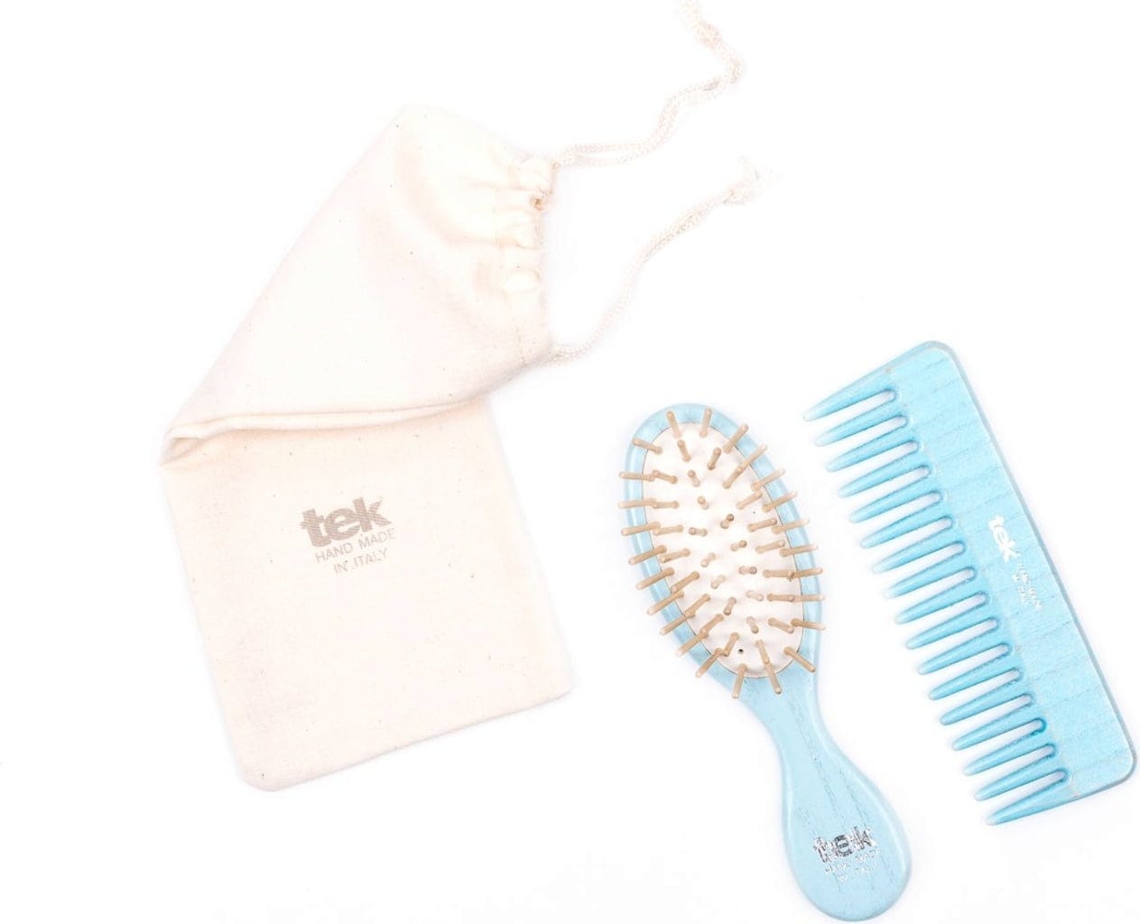 tek tilbyr deg praktiske og flotte, naturlige produkter for hårpleien din med dette settet. Børsten og kammen er ideelle for bruk på farten og passer i enhver veske. De er laget av asketre, FSC®-sertifisert, behandlet med linolje og karnaubavoks. De korte piggene i børsten er laget av bærekraftig avlet agnbøk og er innleiret i en luftpute av naturgummi. Dette gjør børsten ideell for alle hårtyper og gir en behagelig opplevelse når du børster håret ditt.