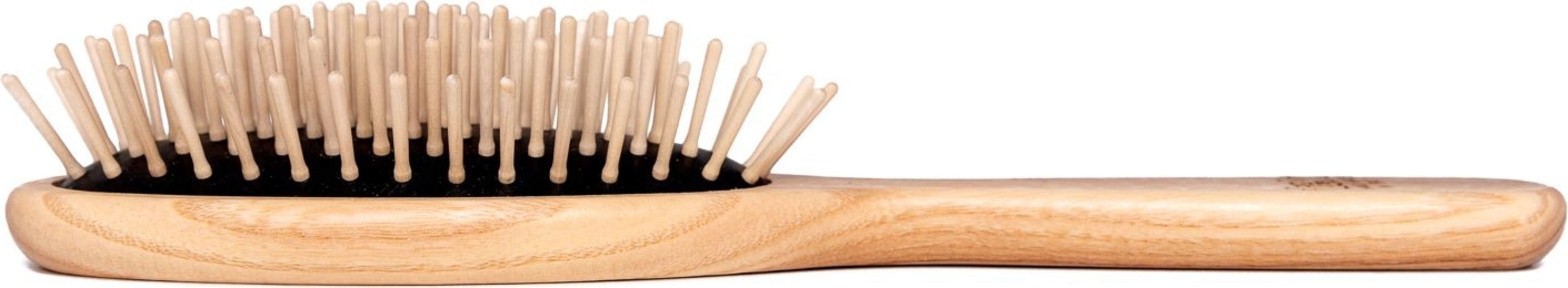 Den store ovale børsten laget av ask er takket være de korte pinnene i agnbøk ideell for alle hårtyper. Luftputen er laget av naturgummi og gjør børsten spesielt skånsom. Treverket er behandlet med linolje og carnaubavoks.