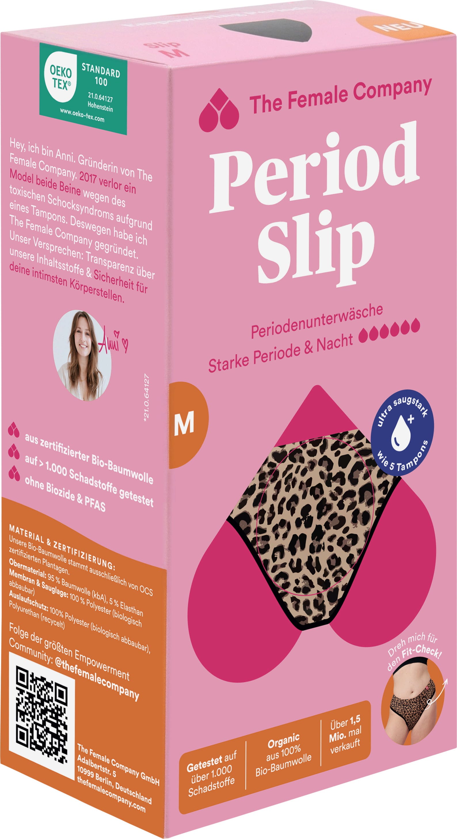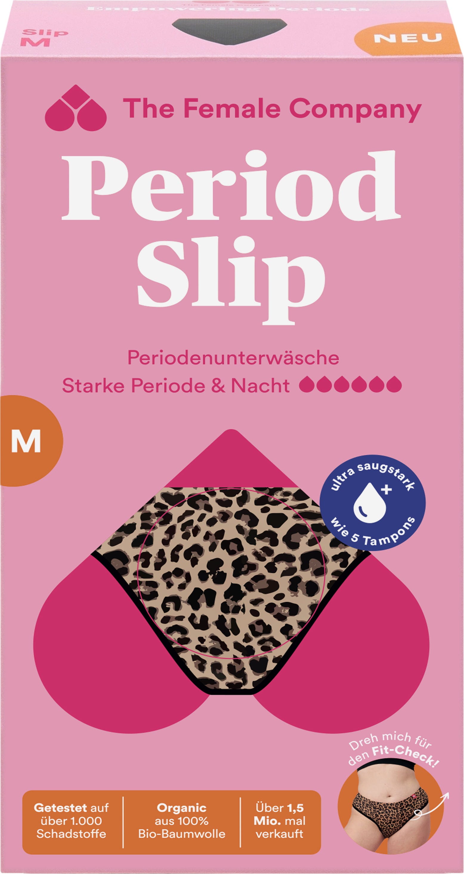Menstrusen i leopardmønster er ekstra absorberende og hurtigtørkende – noe som gjør den til den perfekte partneren under kraftig menstruasjon. Takket være den innovative Fluid Protection®-teknologien tilbyr den også effektiv lekkasjebeskyttelse og er bare 1 mm tykkere enn vanlige truser.