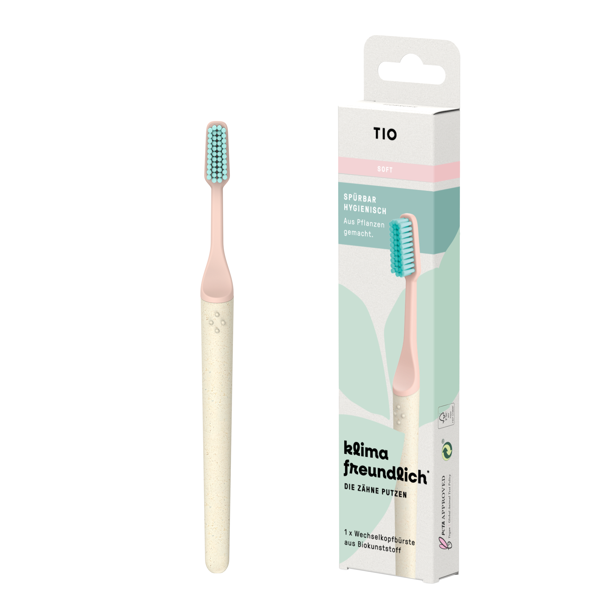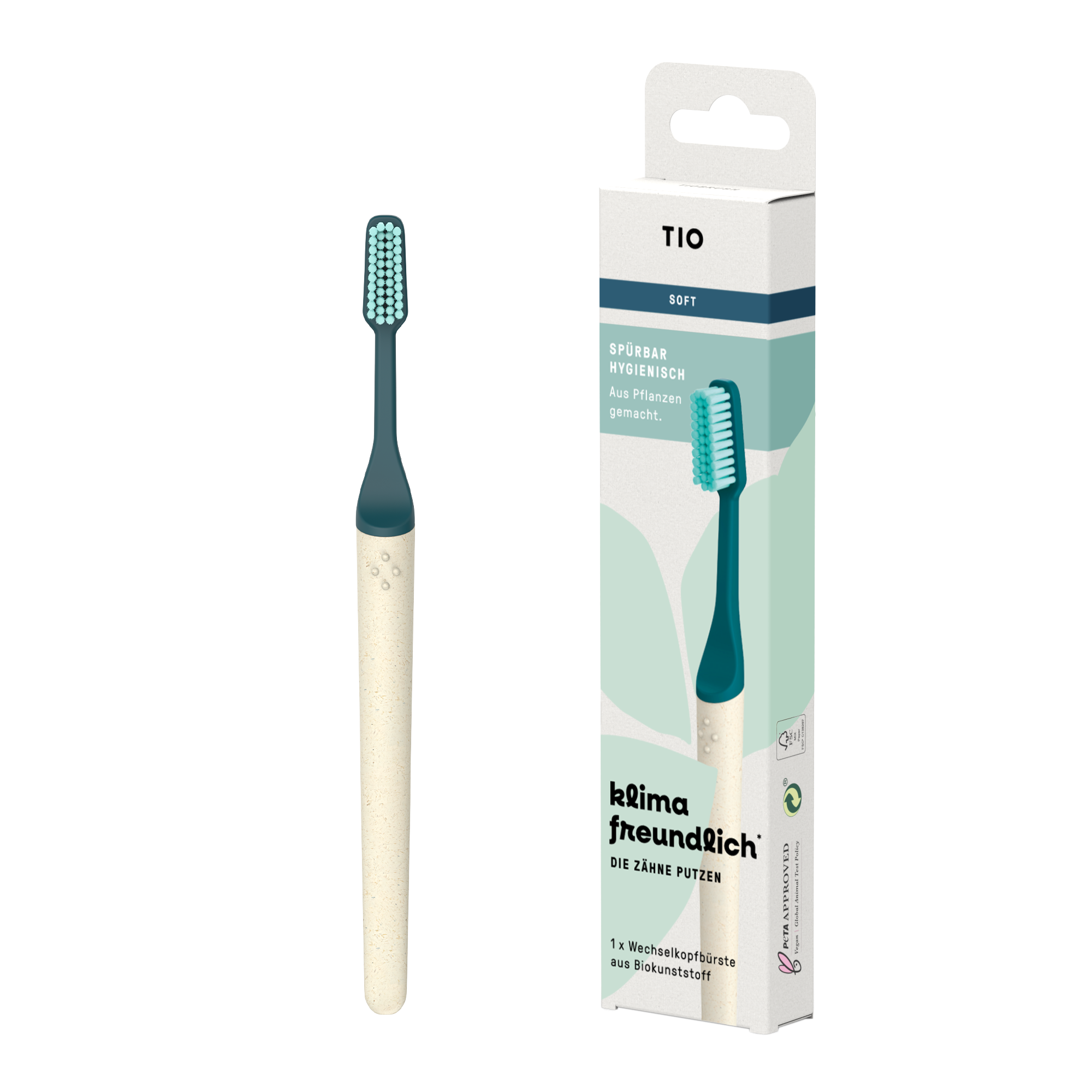 Det bærekraftige børstesystemet fra TIO gir et rent pusseresultat og tar samtidig hensyn til miljøet. Børsteskjelettet er laget av plantebasert bioplast, som er produsert av furunåleolje. Materialet i busten stammer fra ricinusolje som bearbeides til nylon 10.10. Hodene kan kastes i restavfallet etter bruk.