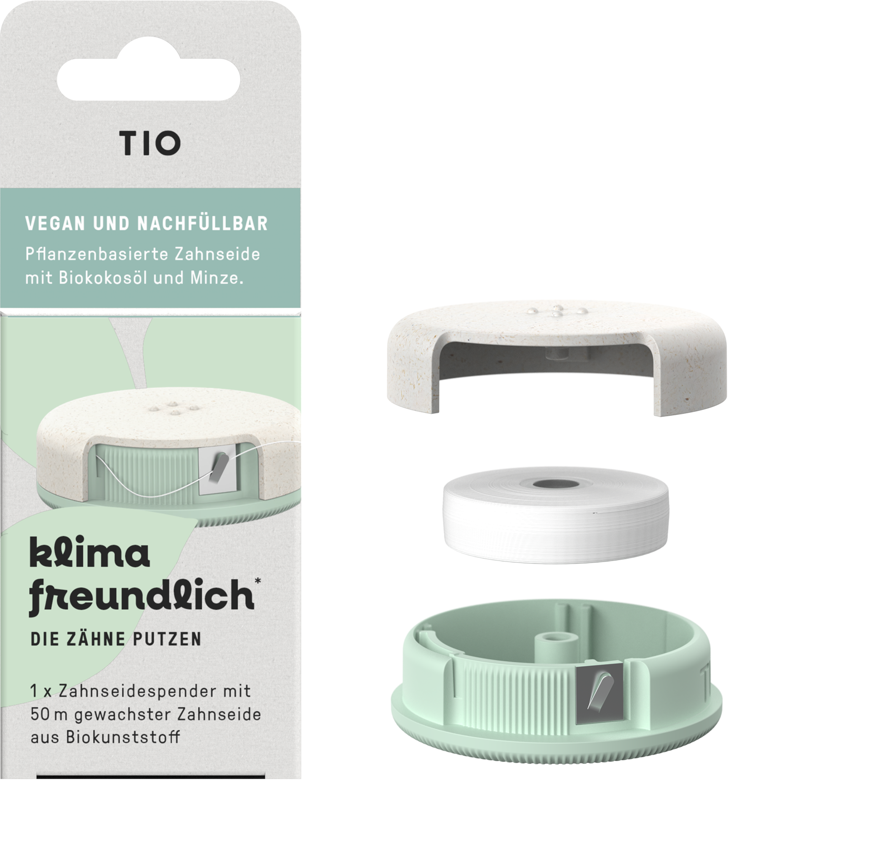 De naturlige fibrene i tanntråden er laget av ricinusolje og er dekket med plantevoks og kokosolje. Dette gjør at den renser mellomrommene grundig og kommer inn i de minste hjørner. Den mintaktige aromaen sørger for frisk og velpleid pust. Etterfyllingsboksen kan lett åpnes og fylles opp igjen. Slik sparer du mye plastavfall.