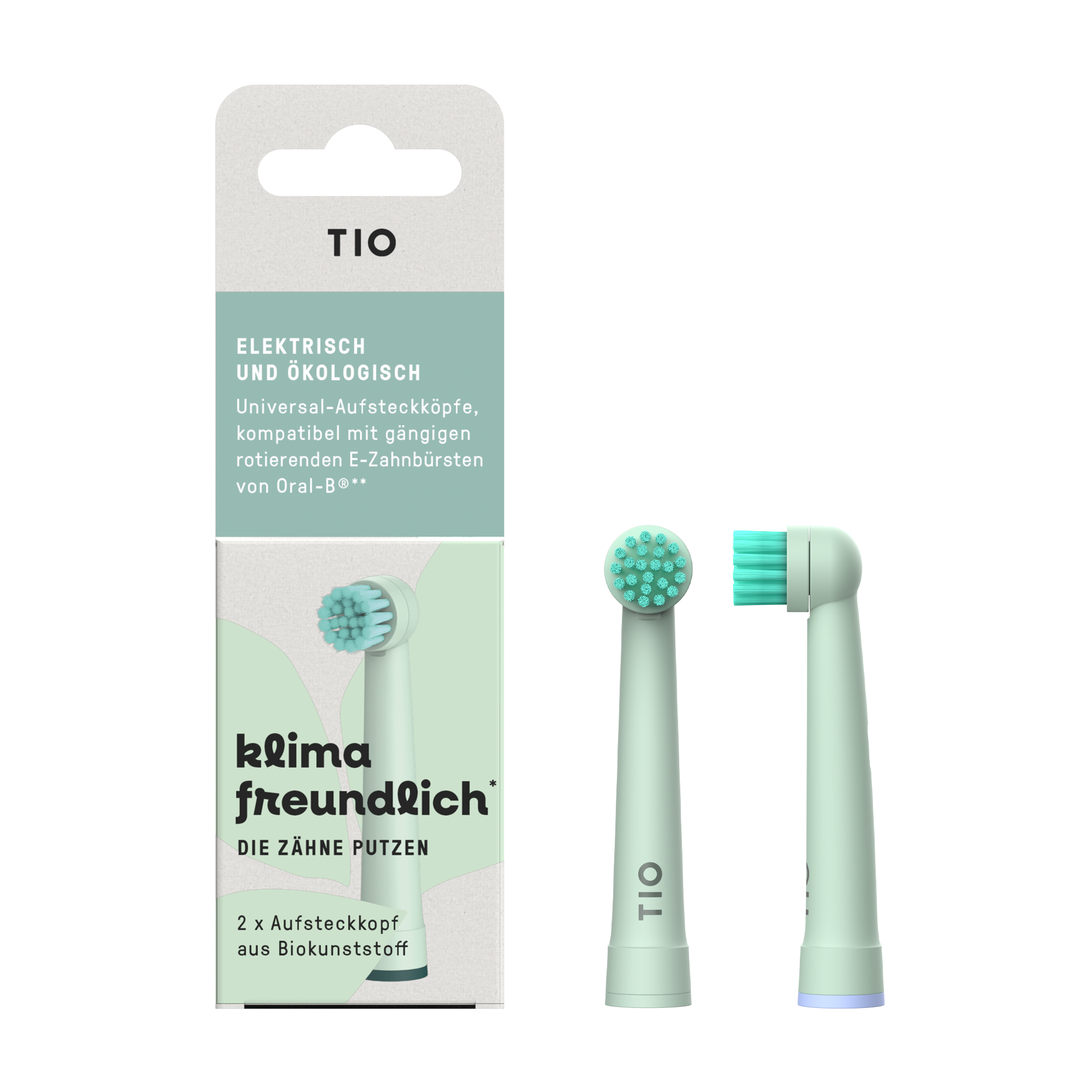 Det runde børstehodet fra TIO rengjør hver tannoverflate skånsomt og grundig, og etterlater et glatt og behagelig følelse. Børstene er laget av Nylon 10.10, et plantebasert alternativ fra ricinusolje. Børstekroppen er laget av furinolje som er omdannet til bioplast, som du enkelt kan kaste i restavfallet. Børstehodene er kompatible med de roterende elektriske tannbørstene fra Oral-B®.