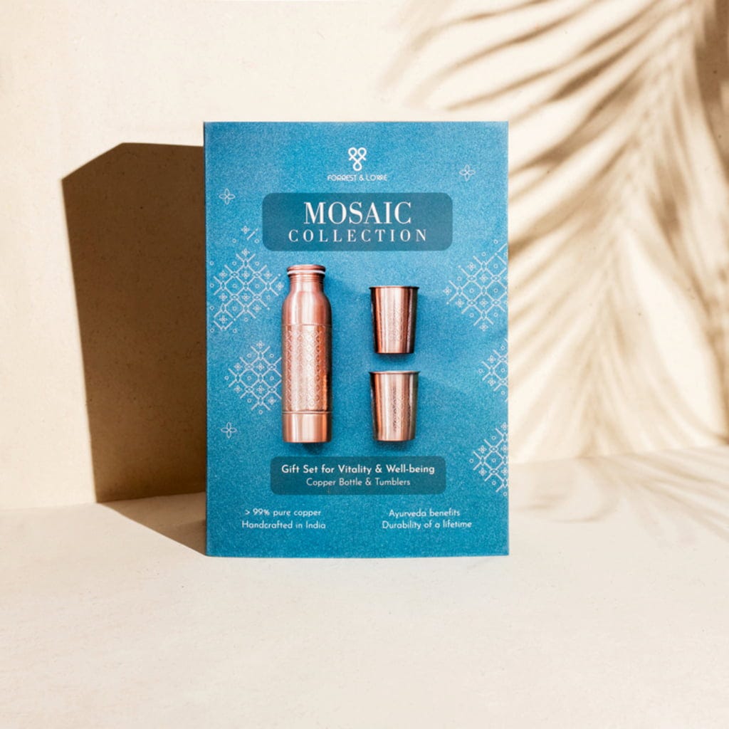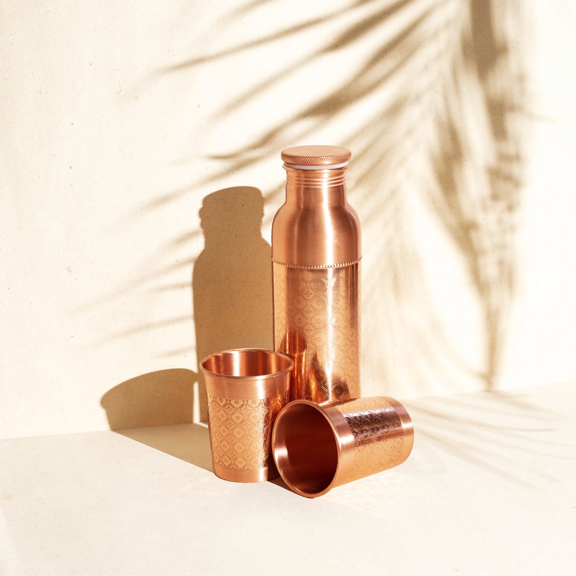 Inspirert av slottlignende trearbeid, imponerer dette fortryllende designet med sin finesse, understreket av kobberglans. Flasken og de to koppene er håndlagede unike stykker og fascinerer med sin geometriske skjønnhet. Kobbersamlingen er en fin, holdbar gave.