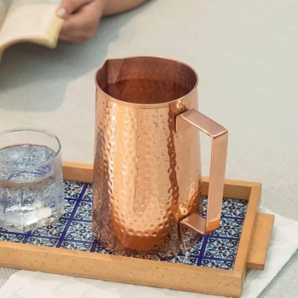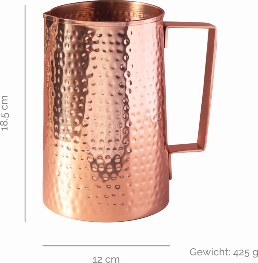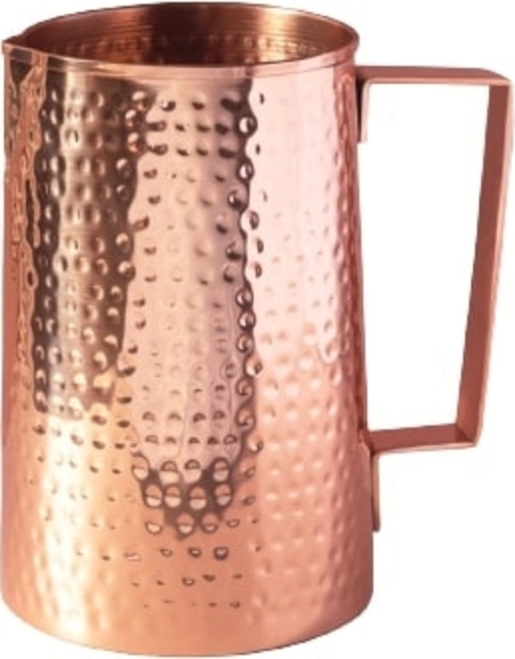 Denne kobberkannen er ideell for servering av stille vann eller kan alternativt brukes som en stilfull blomsterpotte. Kannen er laget av næringsmiddelkvalitets kobber og håndlaget med kjærlighet i India, som kombinerer moderne design med tradisjonelt håndverk. Utvendig er den belagt med en matsikker lakk, mens innsiden er ubehandlet, noe som sørger for naturlig alkalisk vann.