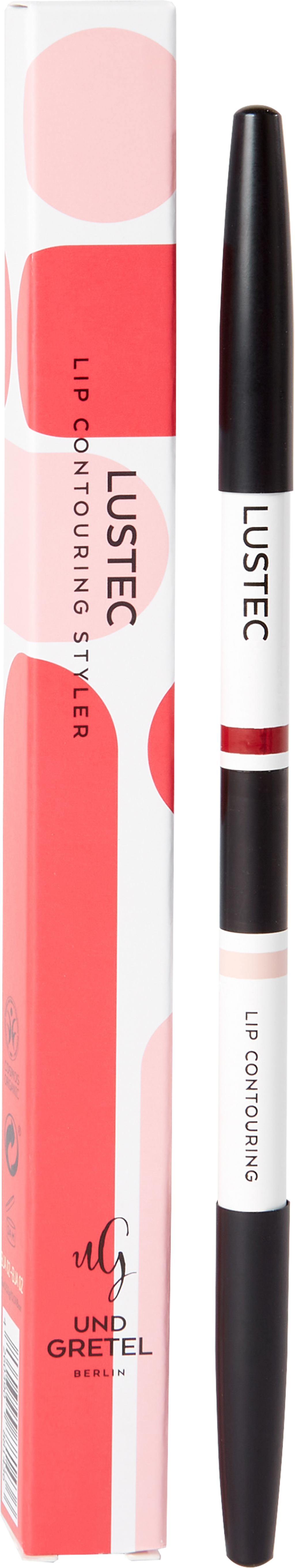 LUSTEC Correcting Lipliner fra UND GRETEL gir deg to funksjoner i én penn: Den transparente enden fungerer som en optisk rynkefjerner og danner en barriære for å hindre at senere påført leppestift renner ut. Denne enden tjener dermed som base eller primer. Den fargede enden gir leppene dine den ønskede fargen og fremhever finishen etter at du for eksempel har påført en lipgloss.