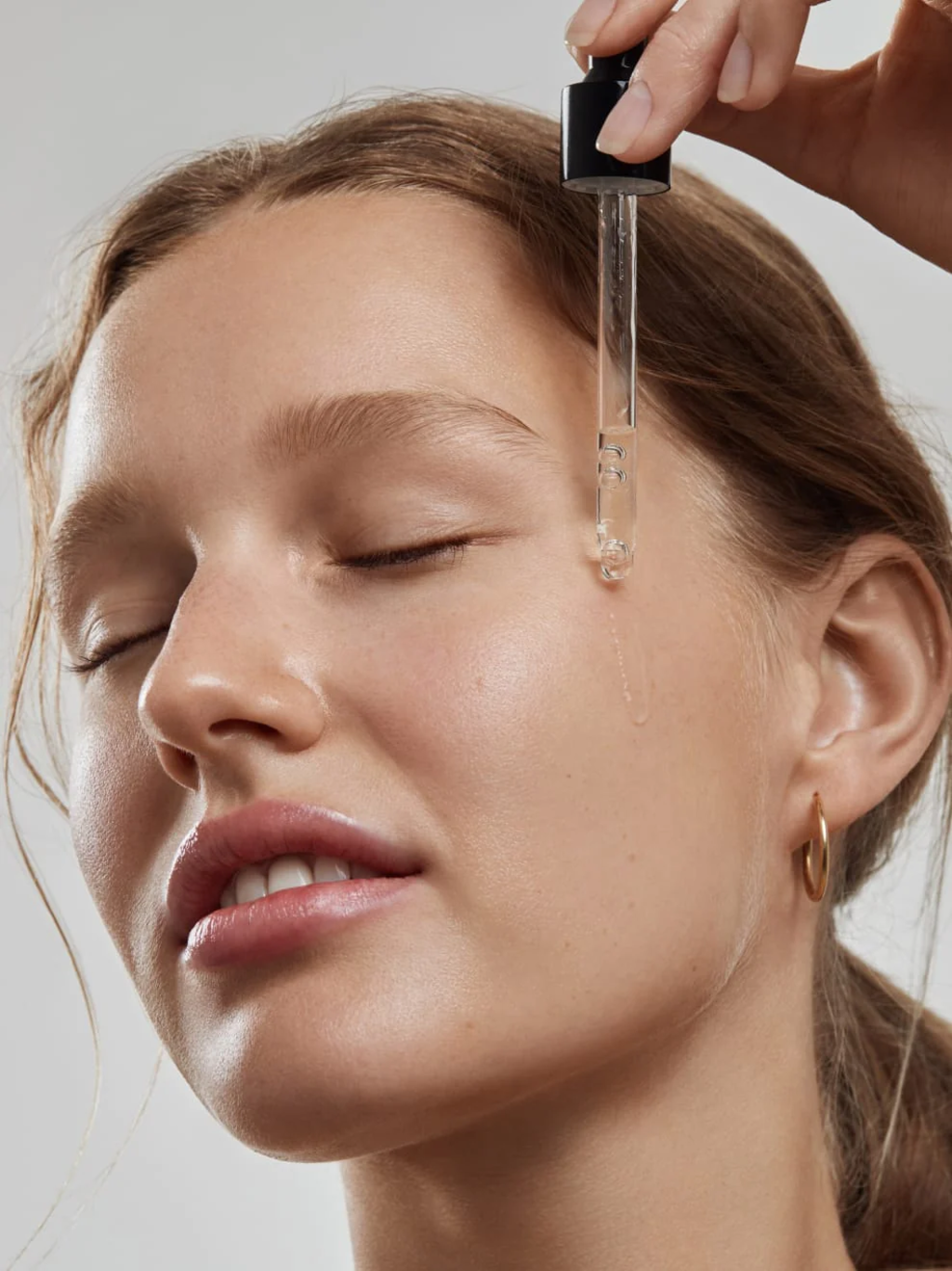 • Drypp deretter 3-4 dråper serum i håndflaten eller direkte på panne, kinn og hake og massér det forsiktig inn. Ikke glem hals og dekolletage!