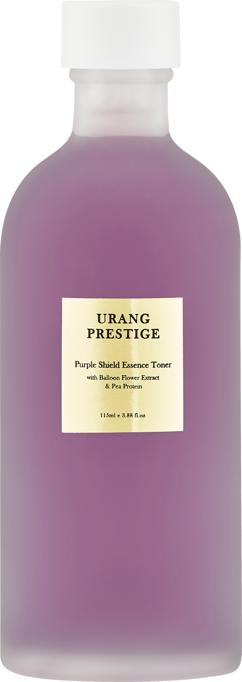 Prestige Purple Shield Essence Toner gir huden en pleiende og rik fuktighetsboost. Formuleringen inneholder ballongblomstekstrakt fra Namwon i Korea, utvunnet gjennom en egenutviklet tretrinns ekstraksjonsmetode fra URANG. Dette gir produktet sin vakre lilla farge og gir huden en nydelig glød. Kombinert med erteprotein og hyaluronsyre tilfører den intensiv fuktighet og har revitaliserende, utjevnende egenskaper. Toneren passer spesielt godt for sensitiv og tørr hud, men kan brukes av alle hudtyper.