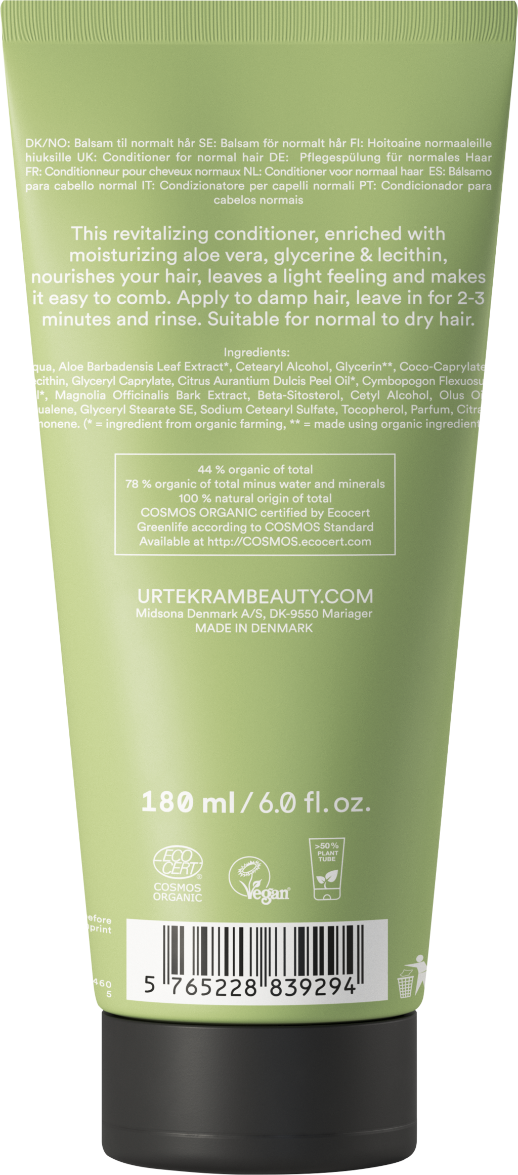 Solmodne appelsiner gir balsamen en frisk duft, mens naturlige fuktighetsgivere som aloe vera og glyserin etterlater håret velpleid og luftig, gjør det lettere å gre og beskytter mot varmebelastning.