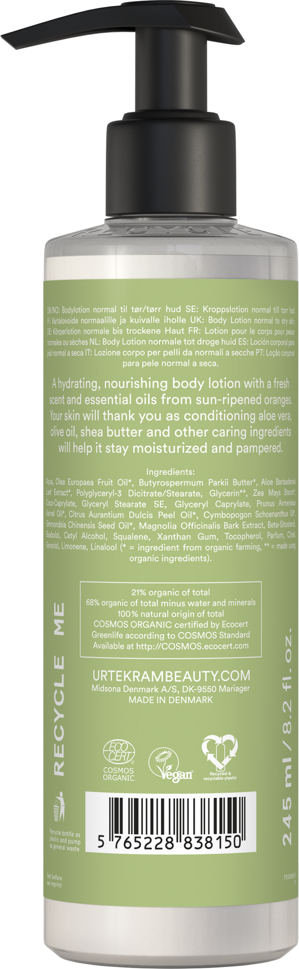Solmodne appelsiner gir lotionen en frisk tone, mens et ekstra høyt innhold av Aloe vera sammen med økologiske oljer fra jojoba, oliven og aprikoskjerner revitaliserer og nærer huden.