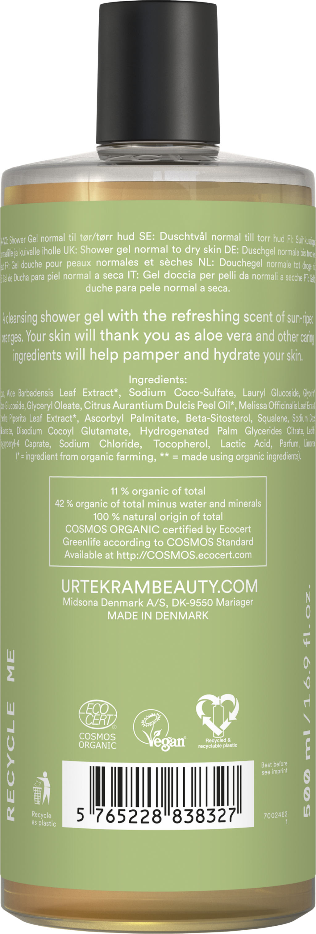 Solemodne appelsiner gir dusjgelen en frisk note, mens et ekstra høyt innhold av Aloe vera sørger for en myk skum full av fuktighet for huden din.