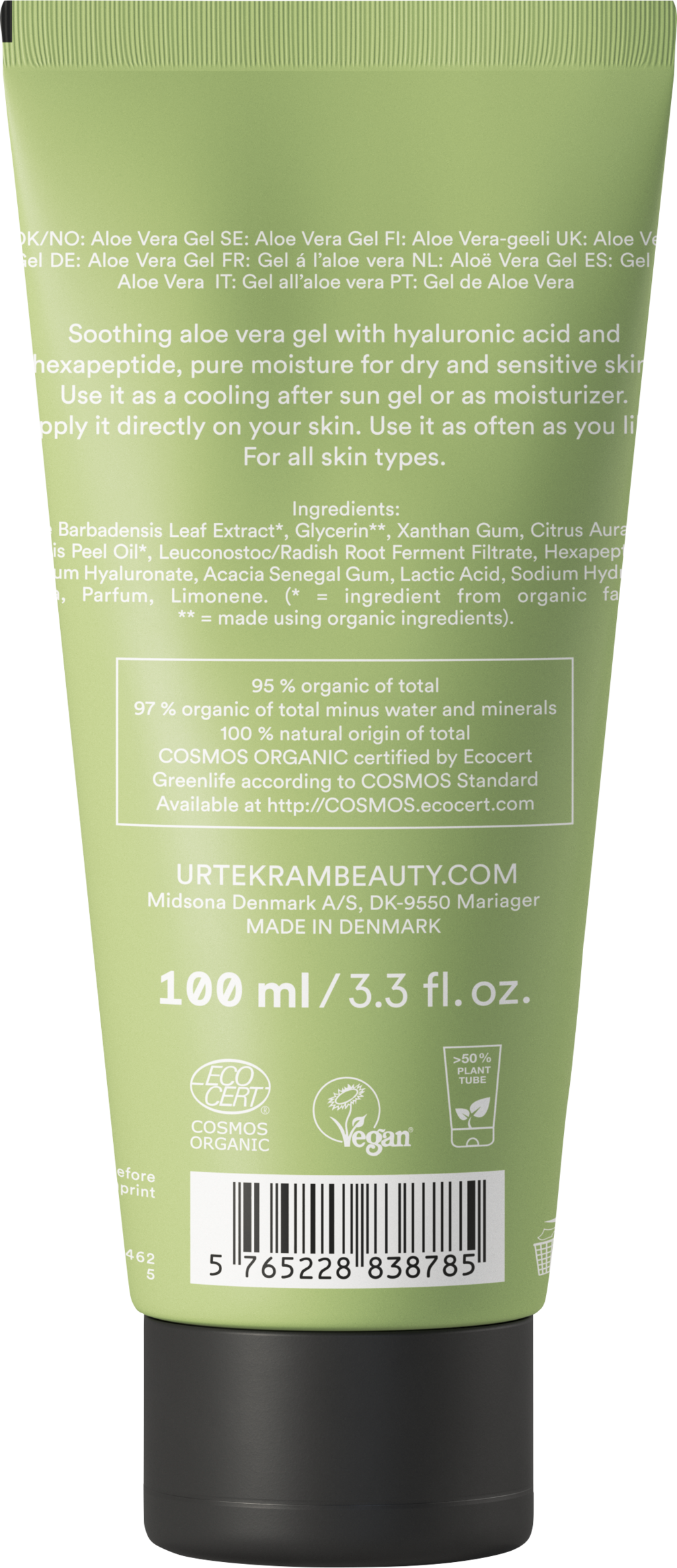 Aloe Vera-gelen fra URTEKRAM® er svært allsidig i bruk. Den passer både til ansikts- og kroppspleie og tilfører huden fuktighet basert på rene planteingredienser. Aloe vera er kjent for sine mange positive egenskaper både når det gjelder pleie og fuktighet. Dette gjør gelen til den perfekte after-sun-pleien. Og om du skulle bli solbrent, kan gelen støtte og fremme hudens velvære. Denne Aloe Vera-gelen inneholder hyaluronsyre og hexapeptider, som i tillegg stimulerer til hudens egen produksjon av elastin og kollagen, og sørger for optimalt næret og hydrert hud.
