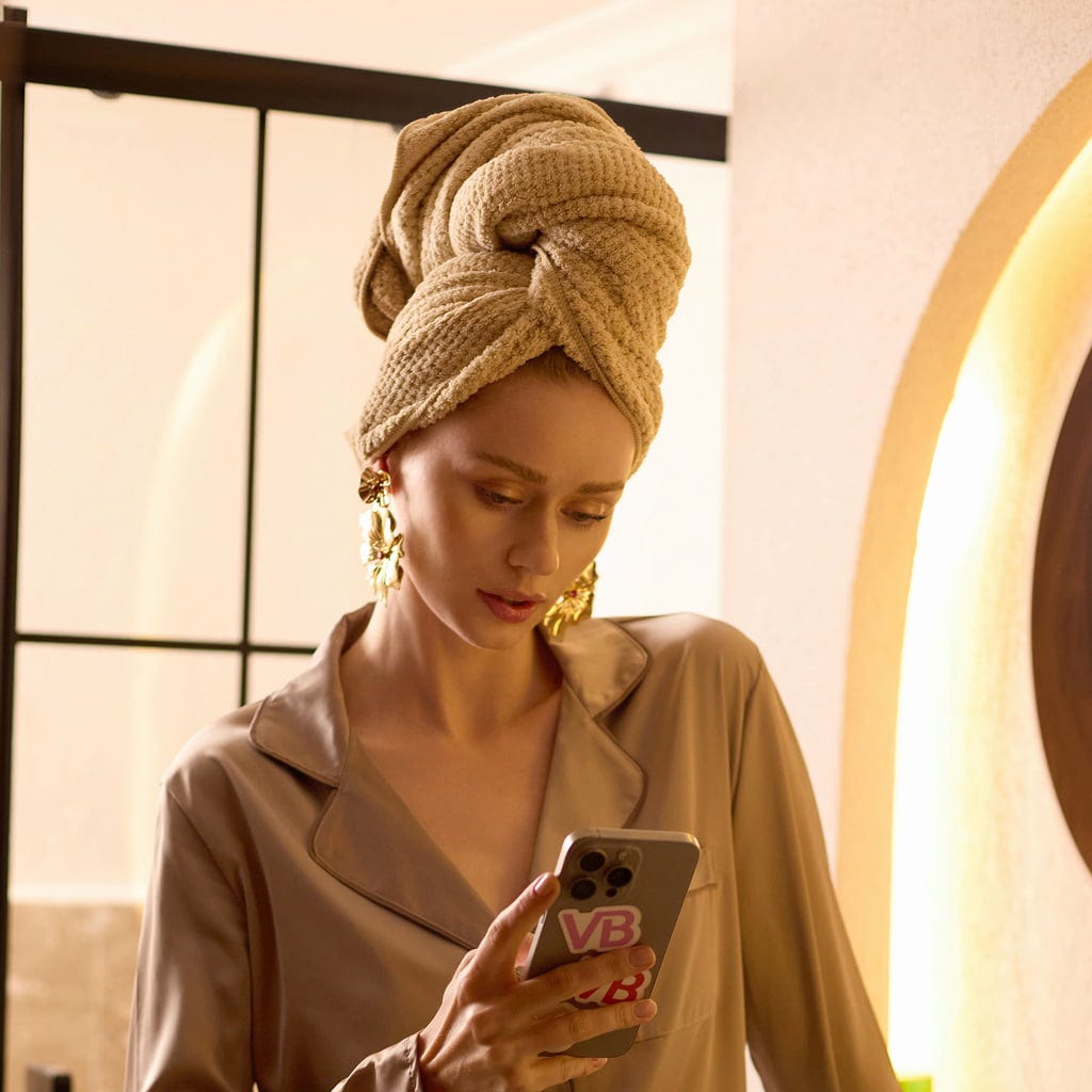 Hårhåndkleet fra Veganboost er laget av mikrofiber, noe som gjør at håret ditt tørker raskt og effektivt. Blandingen av polyester og polyamid gjør håndkleet ekstra mykt og minimerer friksjon, slik at håret ditt beskyttes mot skade. Takket være løkken bak kan håndkleet enkelt vikles til en turban og festes.