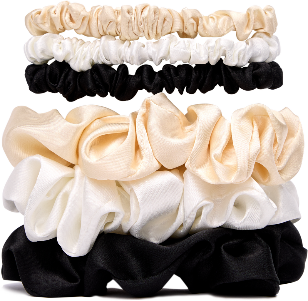 Pakken inneholder totalt 6 hår-scrunchies: 3 små og 3 store scrunchies i fargene svart, hvit og nude.
