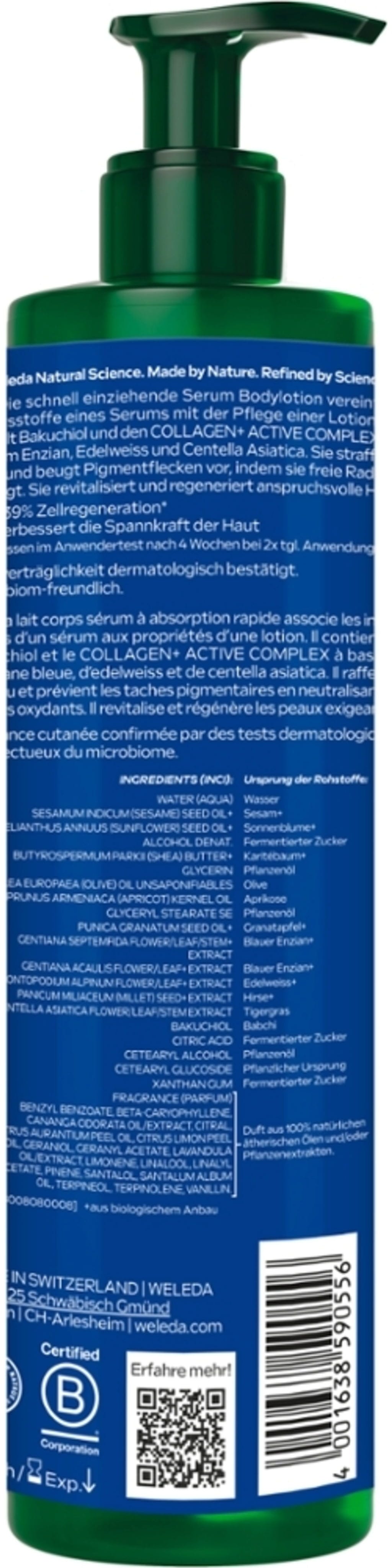 Ingrediensene til et serum og teksturen til en lotion gjør denne kroppslotionen til en spesiell pleie. Den inneholder, i tillegg til den kraftfulle aktive ingrediensen Bakuchiol, også COLLAGEN+ ACTIVE COMPLEX fra Blauer Enzian, Edelweiss og Centella Asiatica, som i synergi gir oppstrammende, revitaliserende og utjevnende egenskaper. Dermed er lotionen også en ideell pleie ved hyperpigmentering.